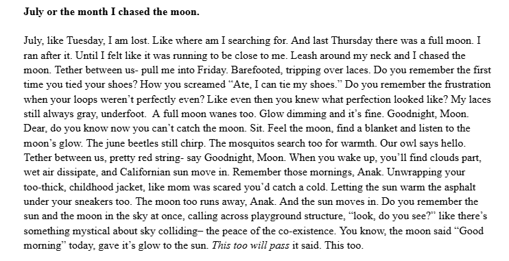 July, like Tuesday, I am lost. Like where am I searching for. And last Thursday there was a full moon. I ran after it. Until I felt like it was running to be close to me. Leash around my neck and I chased the moon. Tether between us- pull me into Friday. Barefooted, tripping over laces. Do you remember the first time you tied your shoes? How you screamed “Ate, I can tie my shoes.” Do you remember the frustration when your loops weren’t perfectly even? Like even then you knew what perfection looked like? My laces still always gray, underfoot. A full moon wanes too. Glow dimming and it’s fine. Goodnight, Moon. Dear, do you know now you can’t catch the moon. Sit. Feel the moon, find a blanket and listen to the moon’s glow. The june beetles still chirp. The mosquitos search too for warmth. Our owl says hello. Tether between us, pretty red string- say Goodnight, Moon. When you wake up, you’ll find clouds part, wet air dissipate, and Californian sun move in. Remember those mornings, Anak. Unwrapping your too-thick, childhood jacket, like mom was scared you’d catch a cold. Letting the sun warm the asphalt under your sneakers too. The moon too runs away, Anak. And the sun moves in. Do you remember the sun and the moon in the sky at once, calling across playground structure, “look, do you see?” like there’s something mystical about sky colliding– the peace of the co-existence. You know, the moon said “Good morning” today, gave it’s glow to the sun. This too will pass it said. This too.