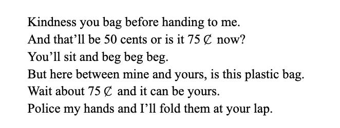 Kindness you bag before handing to me. And that’ll be 50 cents or is it 75¢ now? You’ll sit and beg beg beg. But here between mine and yours, is this plastic bag. Wait about 75¢ and it can be yours. Police my hands and I’ll fold them at your lap.